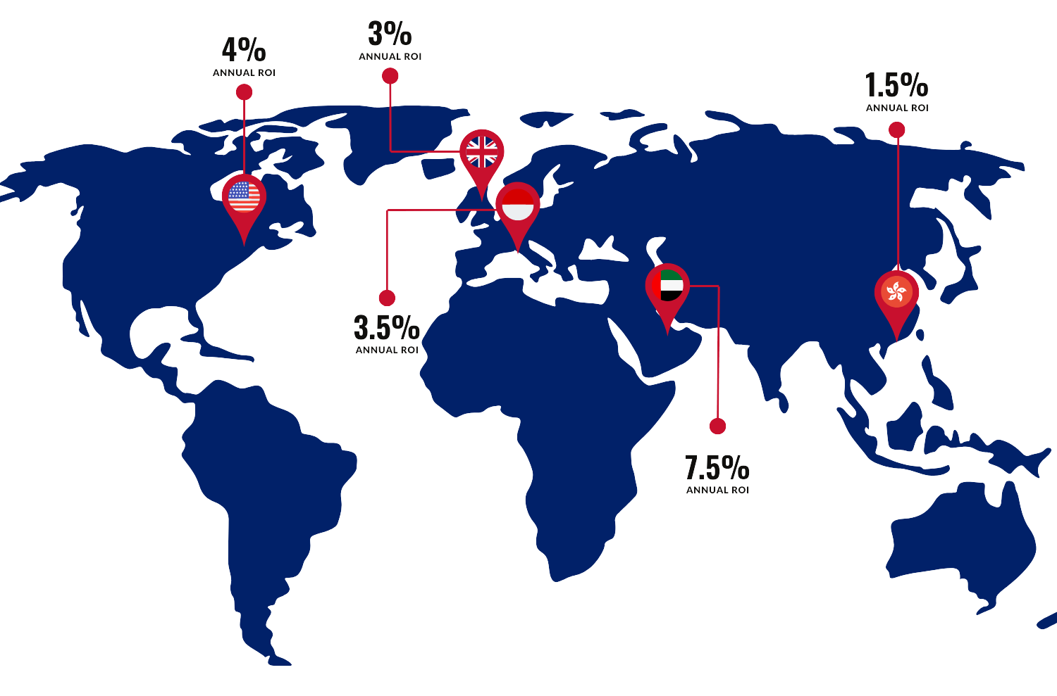Dubai’s real estate market experiences annual capital appreciation of 5-8%, exceeding cities like Monaco (2-3%), Paris (3%), and Hong Kong (4%), ensuring strong long-term growth for investors.